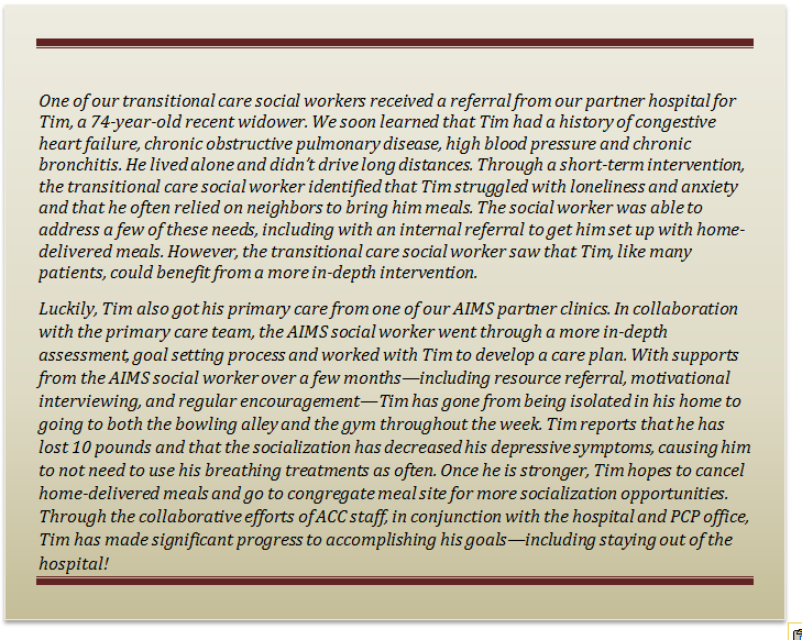 In the past five years, ACC has partnered with primary care practices to implement the AIMS Model. Currently, ACC works with two practices that are part of the same health system for which it provides transitional care. Under the AIMS Model, primary care providers or other members of a clinical team proactively refer clients to AIMS if they identify a patient or caregiver who may benefit from the program. ACC’s AIMS social worker then initiates the AIMS protocol, which includes identifying the patient’s own goals for their health and health care, which often are related to managing chronic conditions and increasing functional capacity. ACC’s AIMS social worker is on-site weekly at each practice, facilitating communication and their integration into the primary care teams. In addition to offering the AIMS Model of care, the social worker trains and consults with the practice’s medical staff to address barriers that may prevent patients from remaining compliant and often educates medical staff about non-traditional ways to meet the needs of patients, such as home visits.
