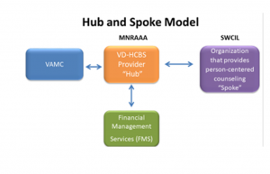 In the early rollout of the VD-HCBS program, Area Agencies on Aging were identified as CBOs that met VA qualifications to engage VAMCs in a service provider agreement. Using a Hub and Spoke business model, MNRAAA performs administrative functions (Hub) and subcontracts with SWCIL (Spoke) to provide person-centered counseling and work directly with veterans and their families. Remarkably, the original team that formed in 2010, Ruth (VAMC), Elaine, (MNRAAA), and Linda (SWCIL) are still working together and meet at least on a quarterly basis. This long-standing partnership between agencies has strengthened the VD-HCBS program at the Sioux Falls VAMC.